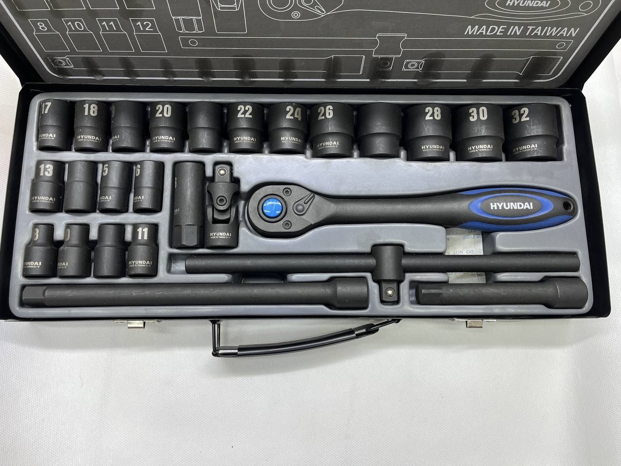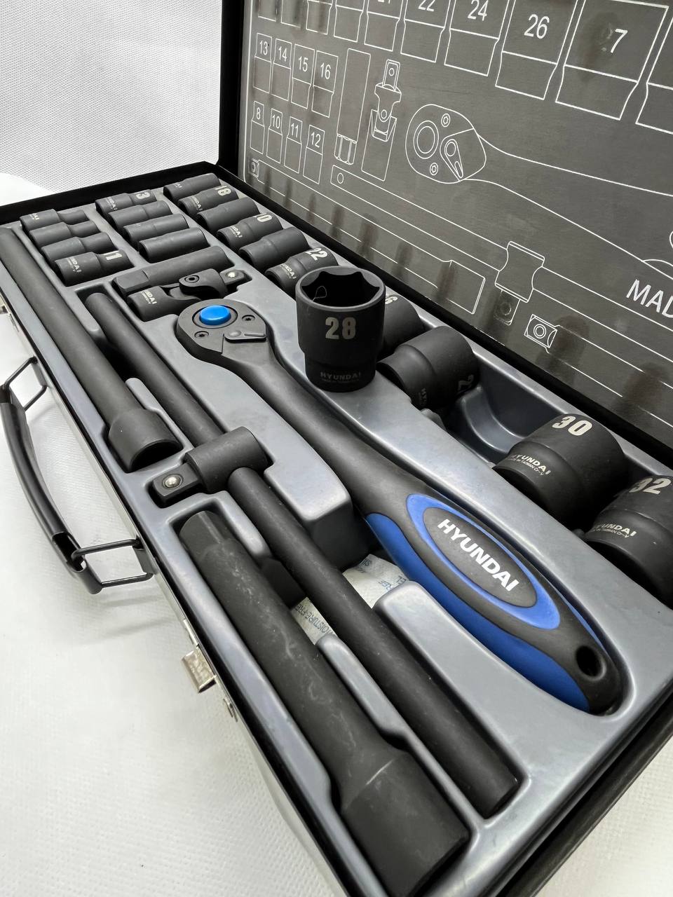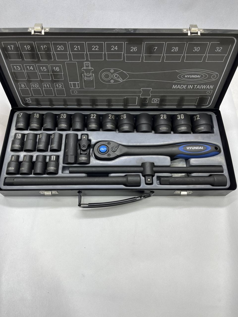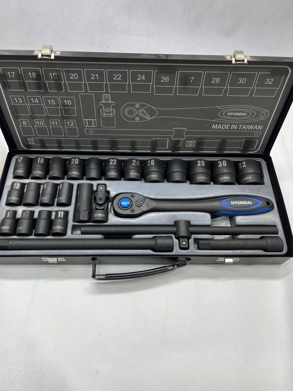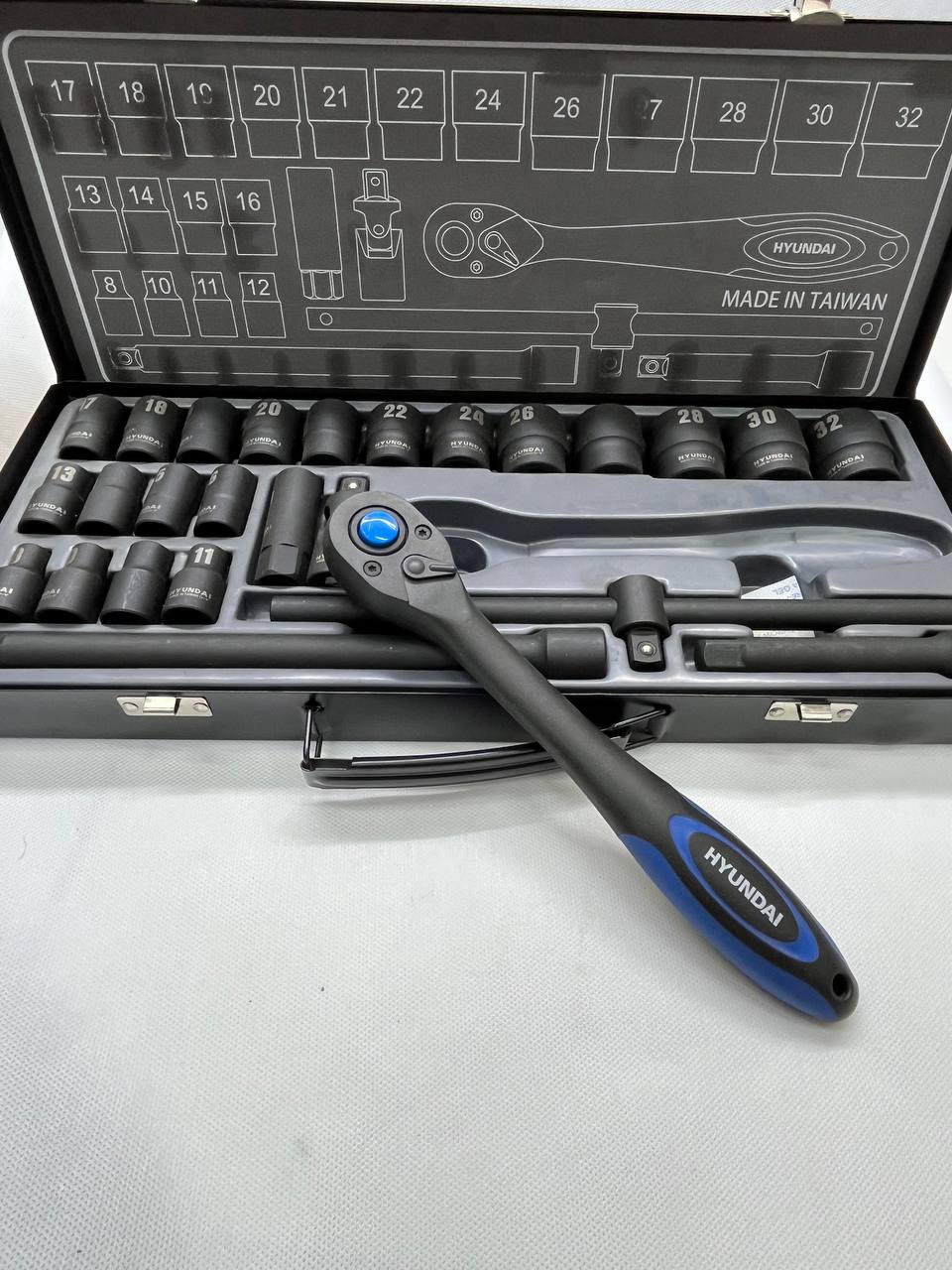 جعبه بکس ۲۶ پارچه برند هیوندای ساخت تایوان، با کیفیت استثنایی ، یه جعبه بکس مادام العمر برای دوستان فنی عزیز، مناسب مصارف فوق العاده سنگین صنعتی و کارگاهی و تعمیرگاهای، ست تکمیل از سایز۸ تا۳۲ مناسب بکس بادی